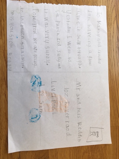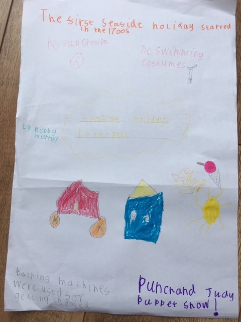 This morning I am giving a HUGE shout out to Scarlett and Bobby who have both sent some fantastic work over to school. Bobby has sent his fact file on seaside holidays in the past as well as his postcard and Scarlett has written a postcard as well, as if she is on holiday, many years ago. Have a look at them below, they are fantastic!