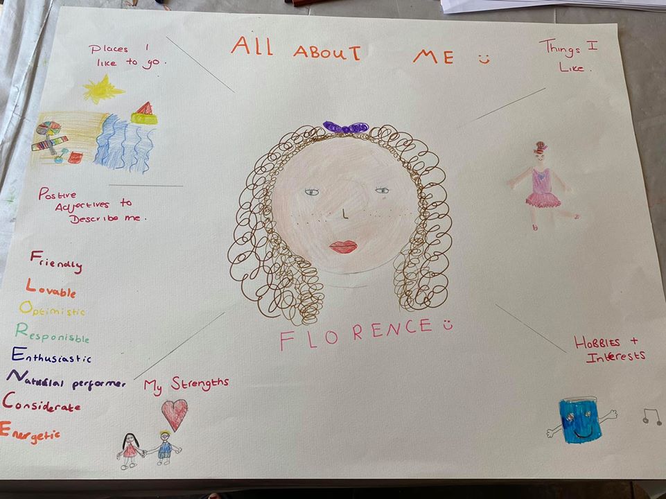 Florence has emailed to show me her All About Me artwork from last week. It is a lovely piece of work! I have attached it to this blog for you all to have a look at.